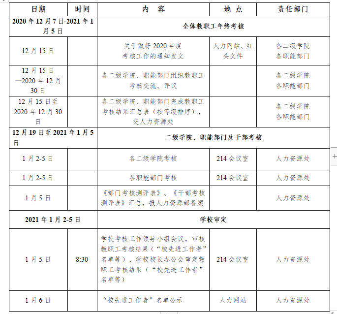 (三)教职工考核 由本单位考核工作小组考核,请各单位在12月中旬开始部署工作,在考核时段(2020年12月15日—2020年12月30日)依据各岗位的考核细则,安排时间完成个人总结、述职、考评、汇总等工作,并于2020年12月31日前将单位考核结果汇总表和教职工个人填写的2020年度考核表交学校人力资源处。